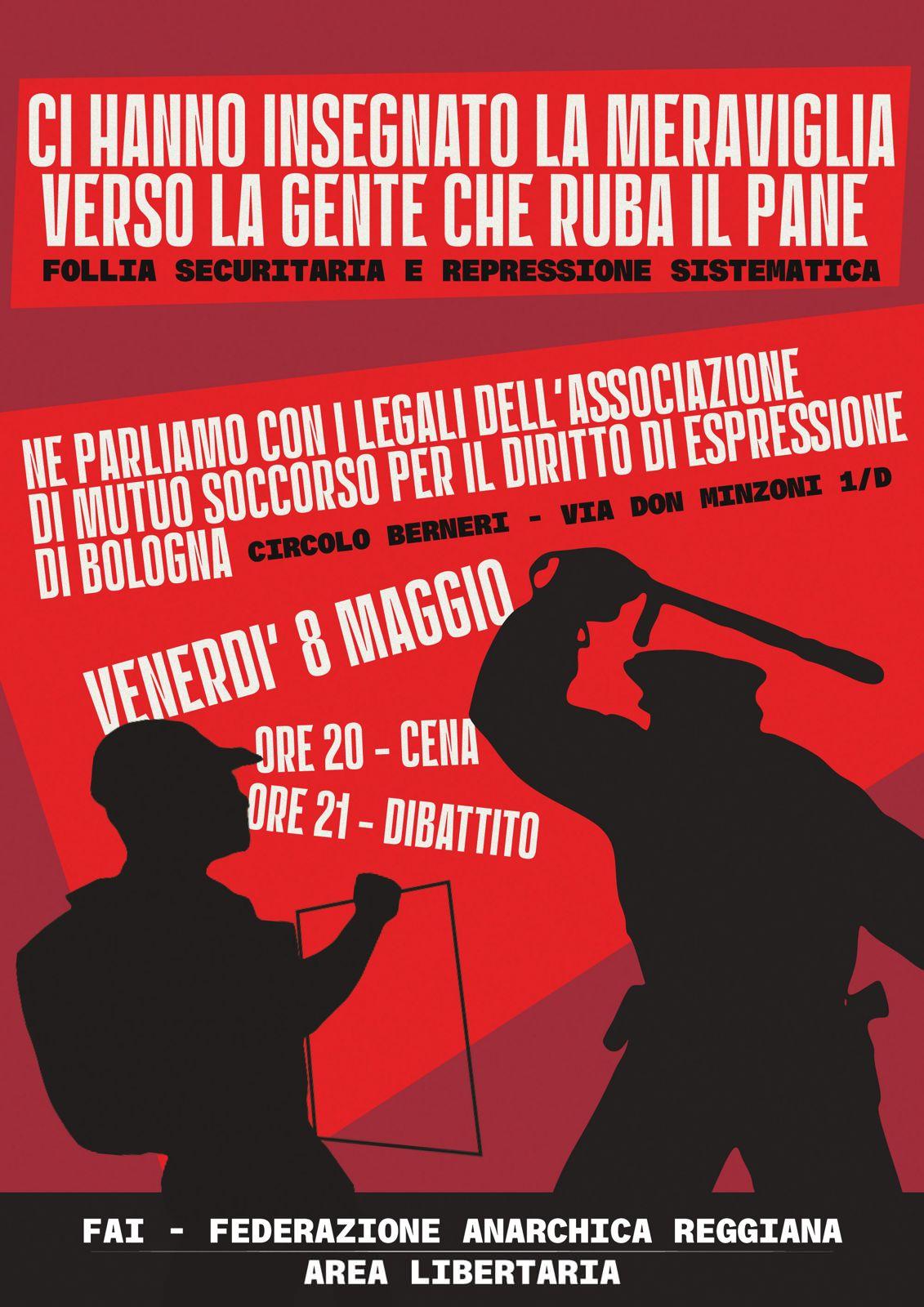 Della repressione e della guerra ai poveri parleremo venerdì 8 maggio alle ore 21.00 al circolo Berneri in via Don Minzoni 1/d a Reggio con i legali dell’Associazione di Mutuo Soccorso per il Diritto di Espressione di Bologna. La serata Inizierà alle 19.30 con un aperitivo conviviale.